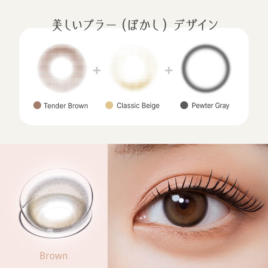 定番ブラウンもブラー効果でドールのようなきゅるんと甘い印象に。 洗練されたブラーリングブラウン。